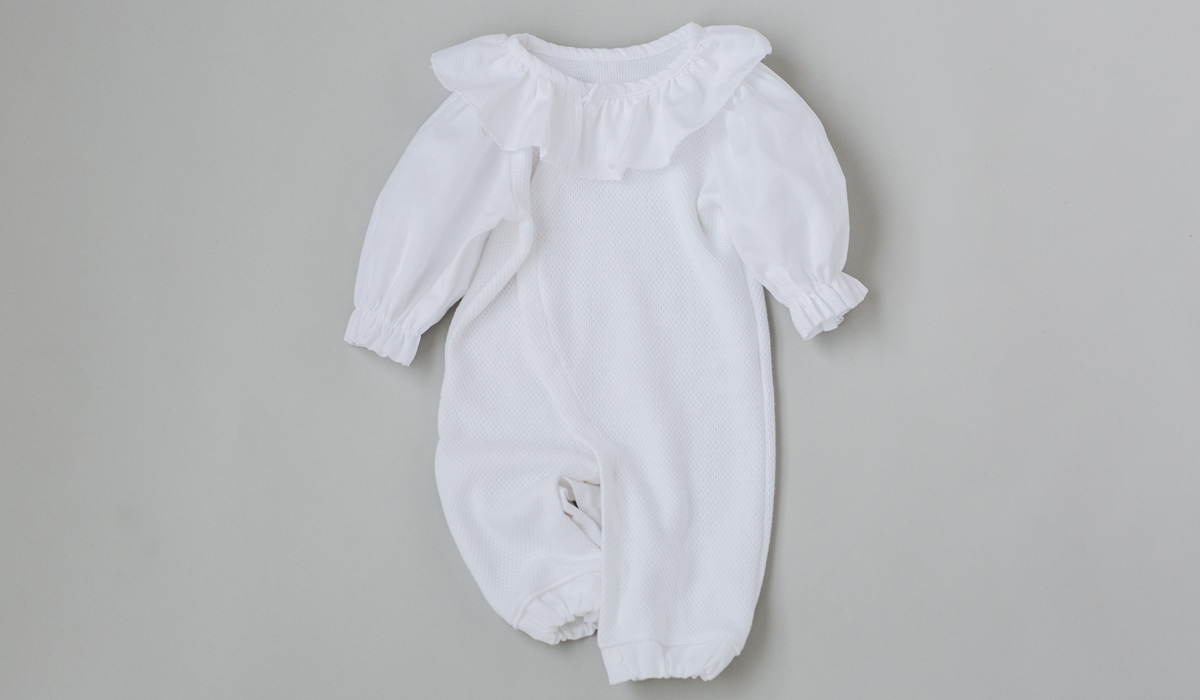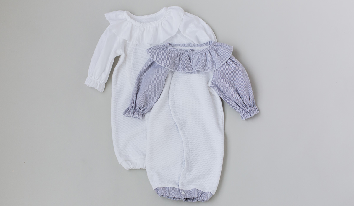 新生児の間はベビードレスとして、少し成長してからはカバーオールタイプに変えられる2Way仕様。